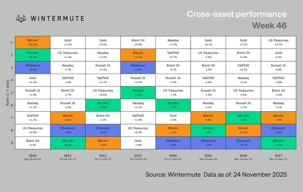 Despite AI optimism, momentum cracked in technology markets, triggering risk-off rotation that pulled crypto below $3 trillion for the first time since April, making it the worst-performing major asset class for a third week.