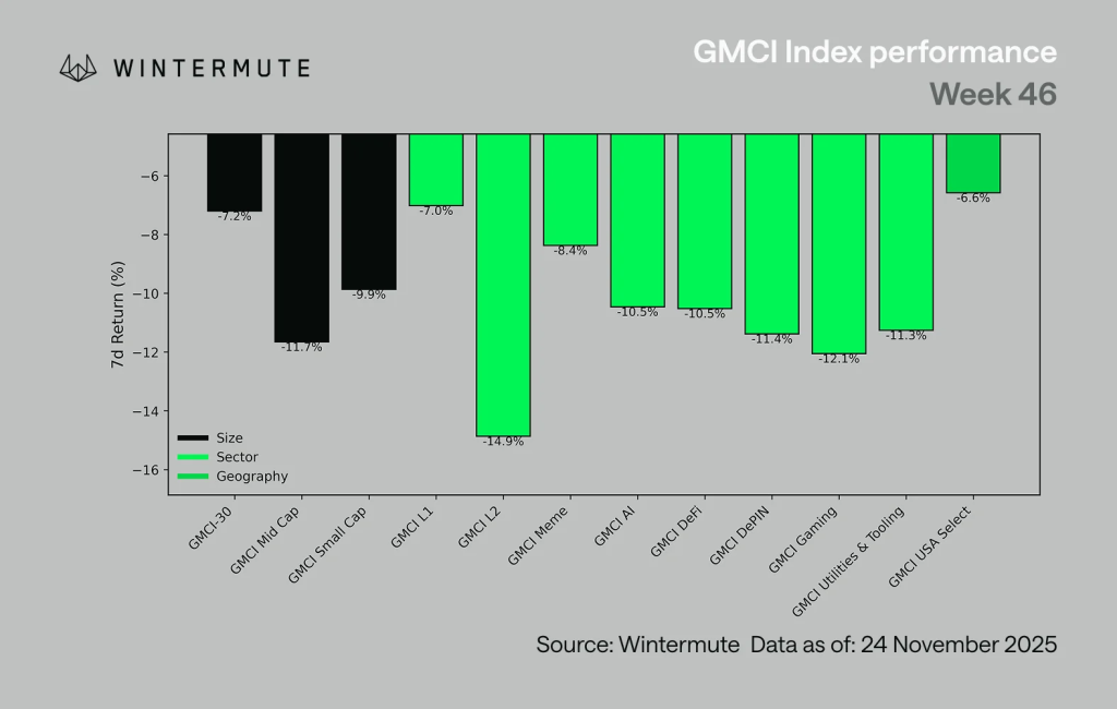 Core Layer-1 protocols declined 7.0% and the GMCI-30 fell 7.2%, demonstrating relatively better resilience. The selloff reflected macro-led derisking across all verticals without discrimination between sectors.