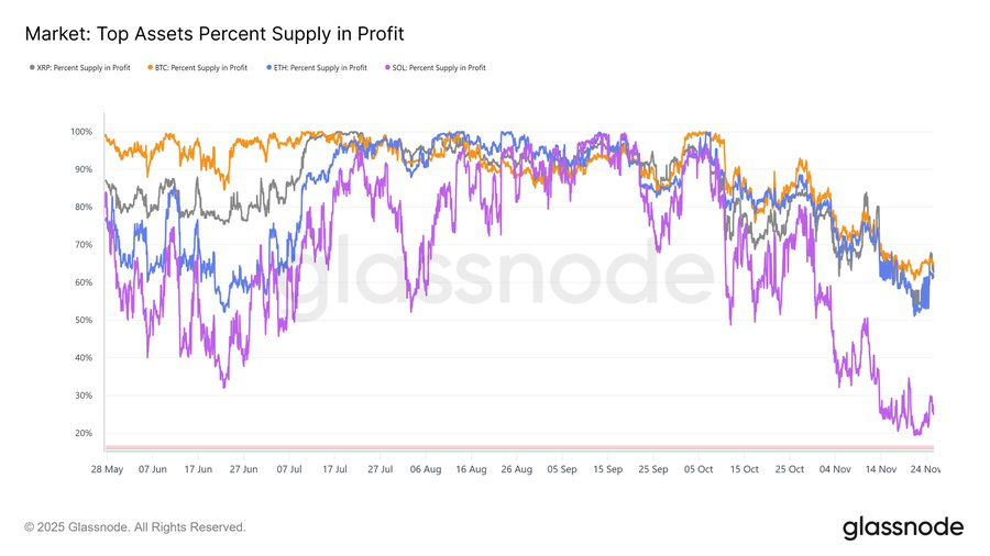 According to glassnode data, a significant portion of major crypto assets are currently trading below their holders’ cost basis a sign of widespread unrealized losses across the market. Bitcoin sits with 34.91% of its supply in loss, while XRP follows closely at 36.70%.