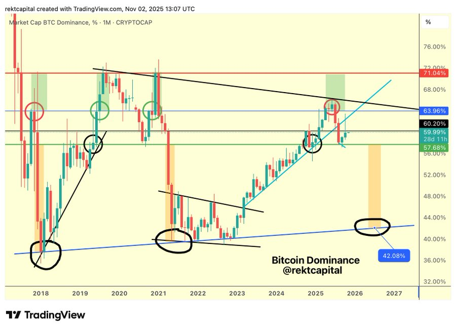 Rekt Capital, a crypto analyst, noted Bitcoin Dominance closed below 60.20% on monthly timeframes. This level continues solidifying as resistance, keeping dominance within the 57.68%-60.20% range.