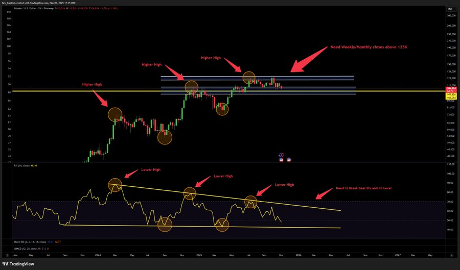 The current chart displays Bitcoin at a decision point. Price consolidates between strong support at $105k and resistance near $115k, forming a range that has held for an extended period.