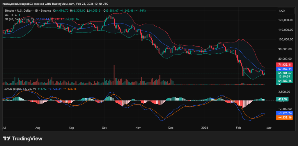 Bitcoin reclaimed the $65,000 level after a sharp decline to approximately $62,000 earlier this week. The flagship cryptocurrency now trades at $65,401.69, marking a 3.35% increase over the past 24 hours. However, BTC remains down 3.83% on the weekly chart and 25.56% lower than its $88,000-$89,000 close last month.