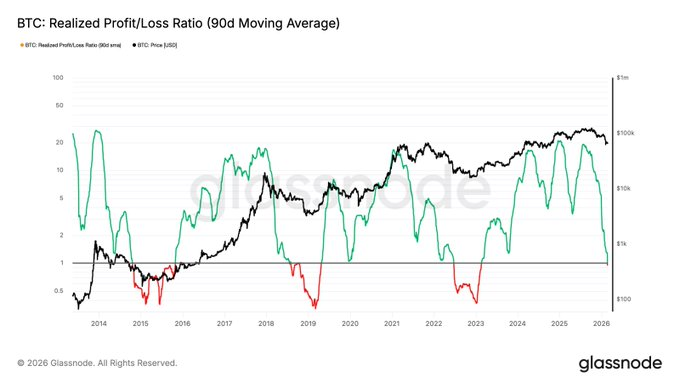 The market capitalization has recovered to $1.3 trillion, reflecting a 3.29% daily gain. Meanwhile, on-chain metrics signal the market has entered a loss-realization regime. The Realized Profit/Loss Ratio (90-day SMA) has fallen below 1, a historically significant threshold.