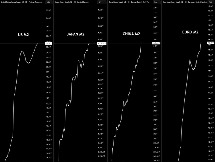 Meanwhile, money supply across major economies sits at all-time highs. The United States, China, Japan, and European Union continue expanding liquidity. BTC trades roughly 45-47% below its all-time high despite this macro expansion.
