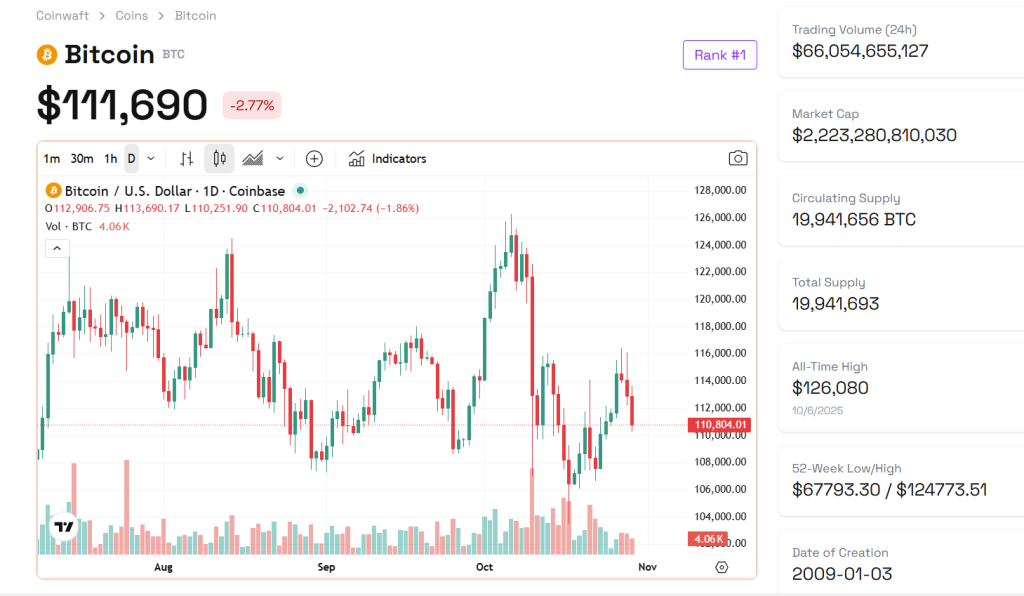 At press time, Bitcoin trades at $111,690, down 2.77% over 24 hours but maintaining a 4.82% weekly gain. The leading cryptocurrency sits approximately 10.37% below its all-time high of $126,270 reached on October 6, 2025, with market capitalization at $2.25 trillion.