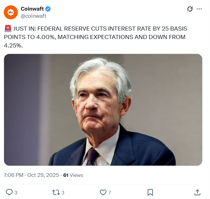 The Fed also announced that quantitative tightening (QT) will officially cease on December 1, signifying a major shift toward monetary easing and potential liquidity boost.