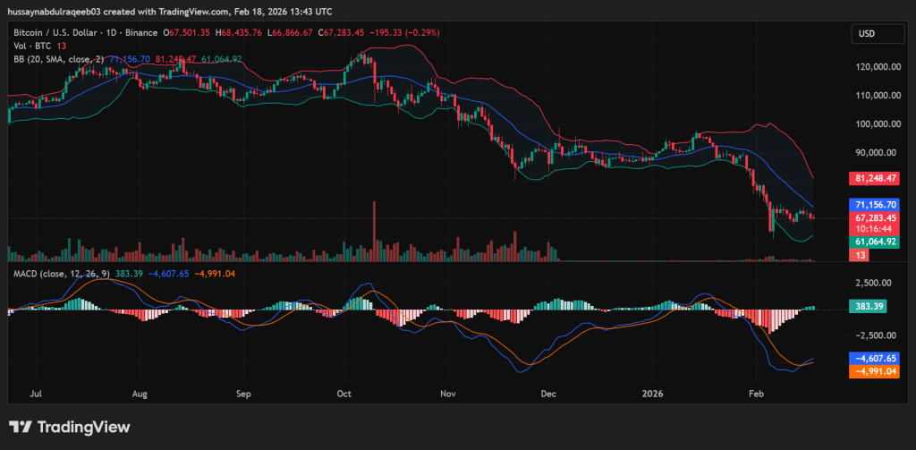 Bitcoin has declined approximately 44% from its cycle peak near $120,000 to the current $67K level. The price is testing the critical $66,800-$67,000 support zone, which coincides with the lower Bollinger Band.