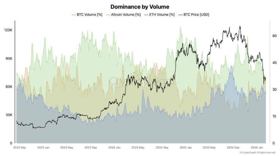 Bitcoin has retreated to $67,469, posting a 1.2% decline over 24 hours after failing to hold the $68,000 level. Meanwhile, altcoin trading volumes on Binance have contracted by nearly 50% since November. This capital rotation pattern has historically appeared during late-stage bear market corrections.