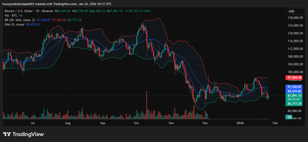 Bitcoin trades at $87,891 with the 9-day EMA at $89,479 acting as immediate resistance. The 20-day SMA sits at $91,530, representing a major hurdle for bulls.