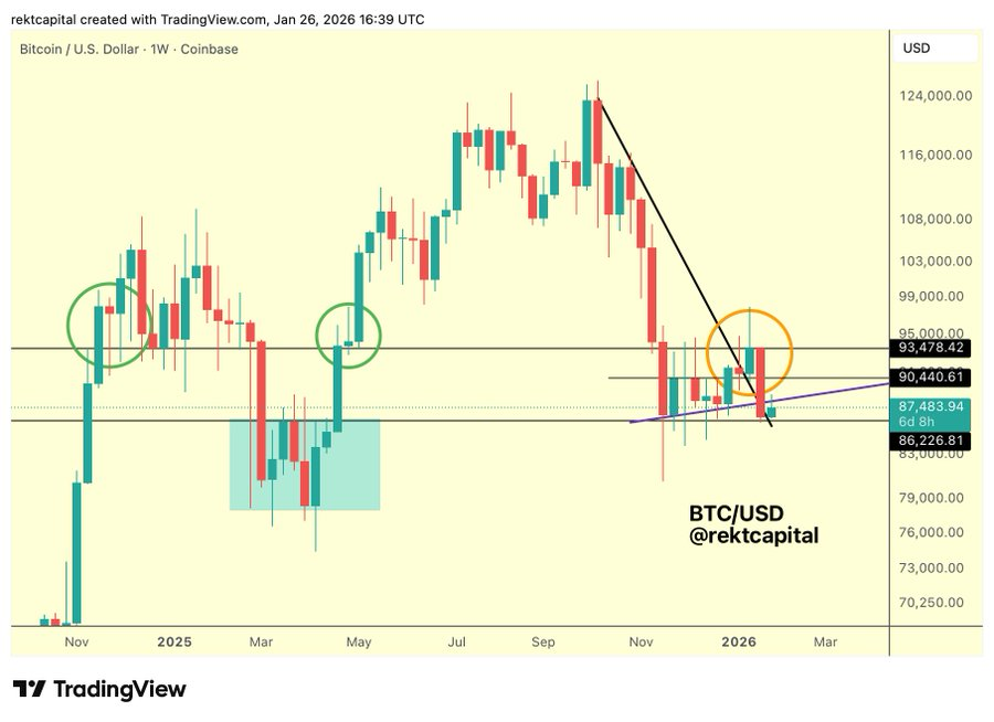 Analyst RektCapital noted Bitcoin’s weekly close fell below the $90,500 mid-range. Price also dropped below a multi-week higher low. However, Bitcoin remains within the broader $86,000 to $93,500 range.