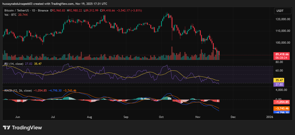 - Technical indicators show deeply oversold conditions with RSI at 27.02 and bearish MACD, with critical support at $90,000 and next major level at $85,700 if current floor breaks.