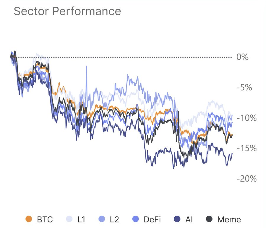 The broader crypto market has shed approximately 25% of its value over six weeks. High leverage and forced liquidations are accelerating the selloff through cascade effects across exchanges.
