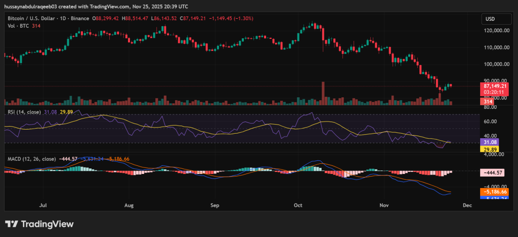 Bitcoin retreated to $86,352 on November 25, following a brief rally to $89,000 the previous day. The decline represents a 2.63% drop in 24 hours and 7.3% over seven days.