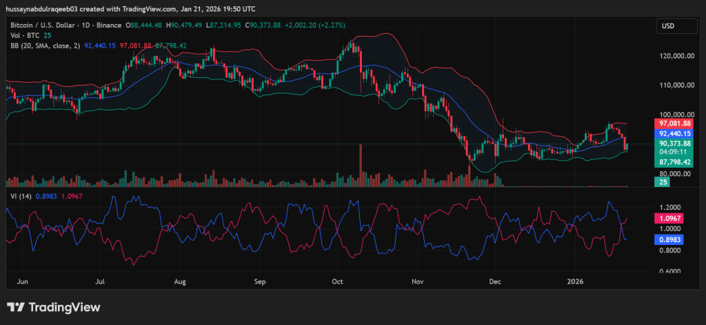 Bitcoin is trading at $90,373.88, positioned near the lower Bollinger Band at $87,798. The middle band sits at $92,440, while the upper band reaches $97,081. Price action near the lower band suggests oversold conditions on the daily timeframe.