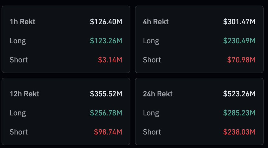 Derivatives markets experienced $523 million in liquidations over 24 hours, with $109 million occurring within a single hour. Long positions accounted for the majority of these liquidations, forcing leveraged traders to sell and amplifying the downturn.