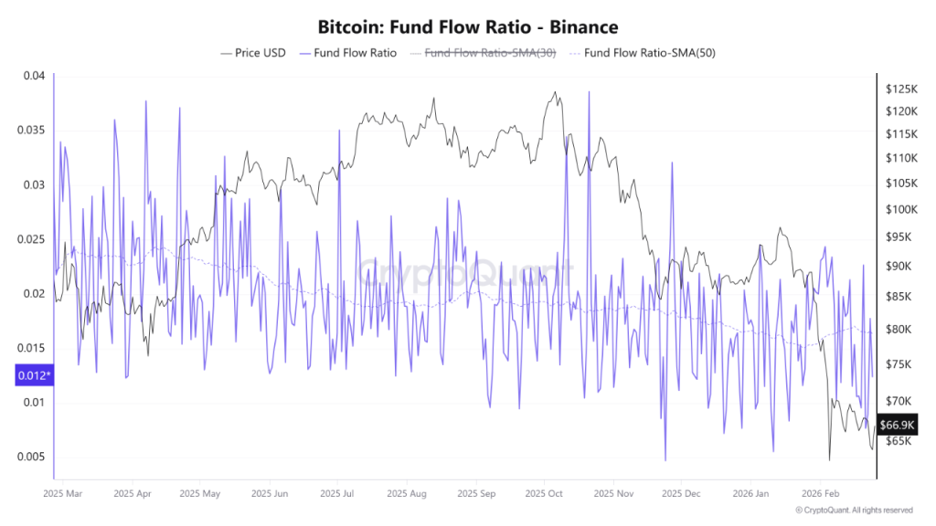 The Fund Flow Ratio currently sits at 0.012, a notably low level. This metric tracks BTC flowing into Binance relative to total holdings on the exchange. Fewer coins moving to exchanges typically reduces immediate sell-side pressure.