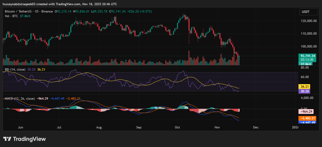 Bitcoin’s 14-day RSI dropped to 30.20, entering oversold territory. The indicator suggests sustained pressure on momentum but also potential for a short-term bounce. The RSI has been trending downward, confirming bearish momentum overall.