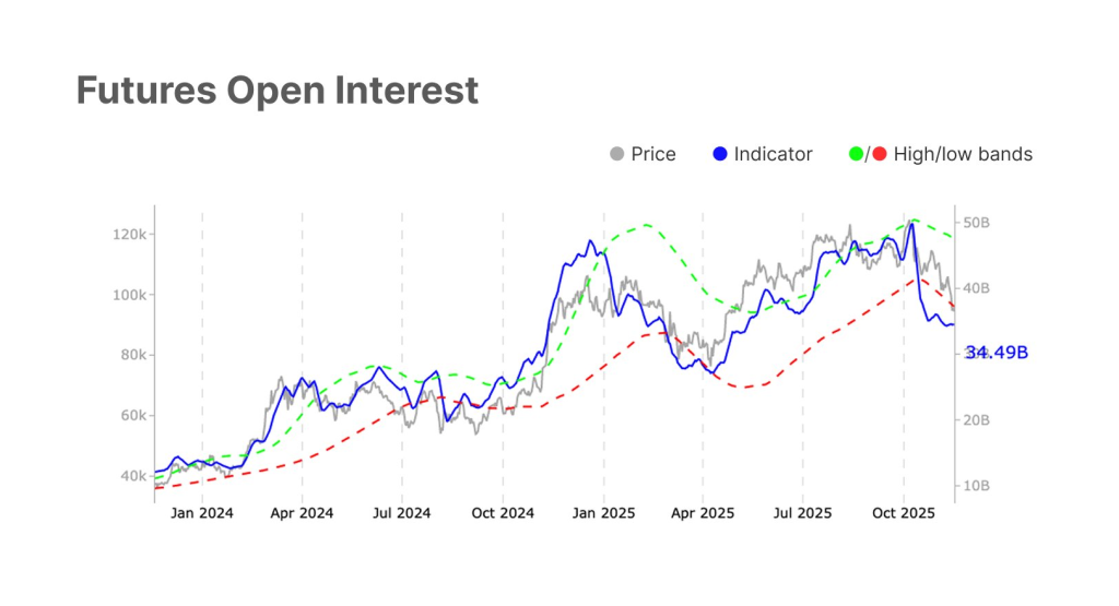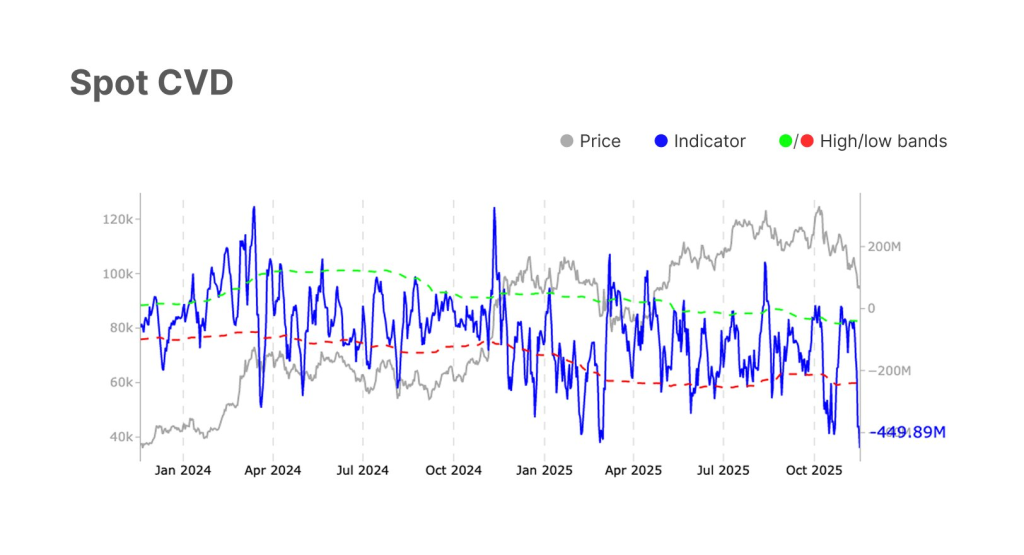Derivatives markets show a 21% drop in open interest since October. The leverage reset typically precedes healthier reversals. Futures CVD slope and Perpetual CVD have plunged to extreme negatives, showcasing strong sell-side dominance.