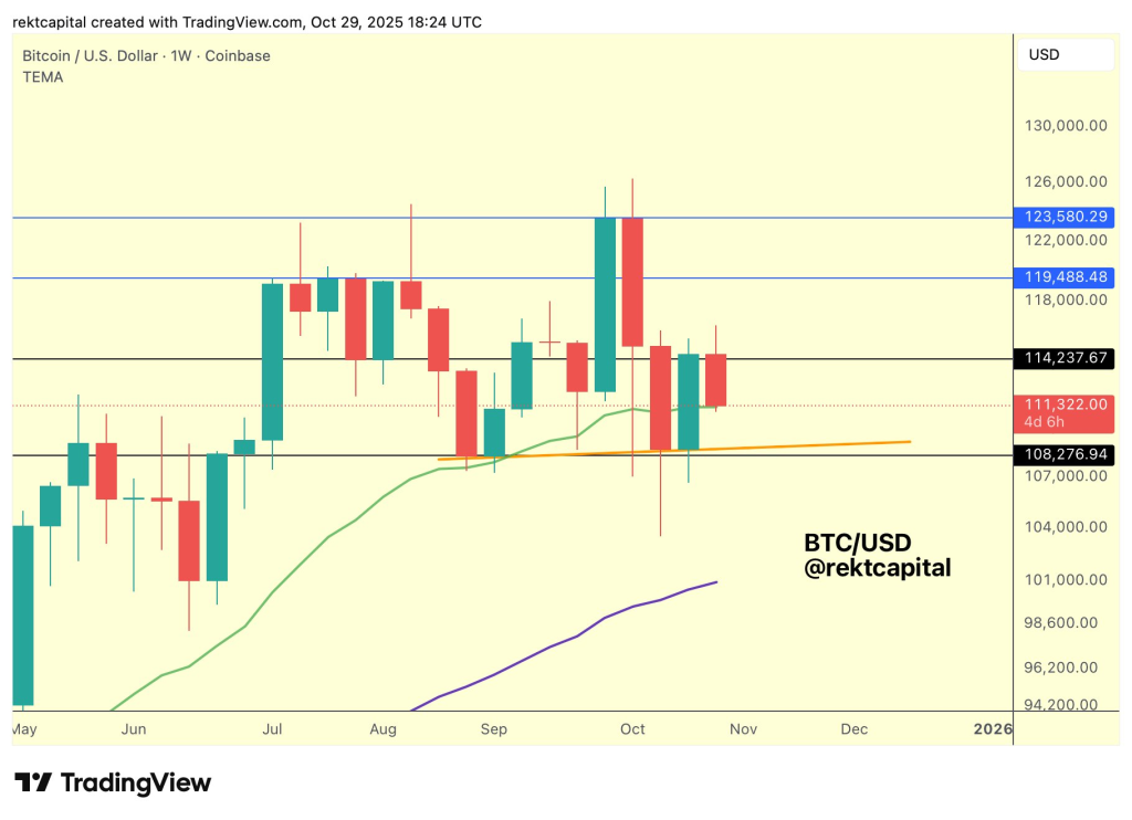 Key resistance stands at $114,500, with breakout targets at $125,000 and potential extension to $128,000. Support remains at the 21-week EMA and $108,000 zone.
