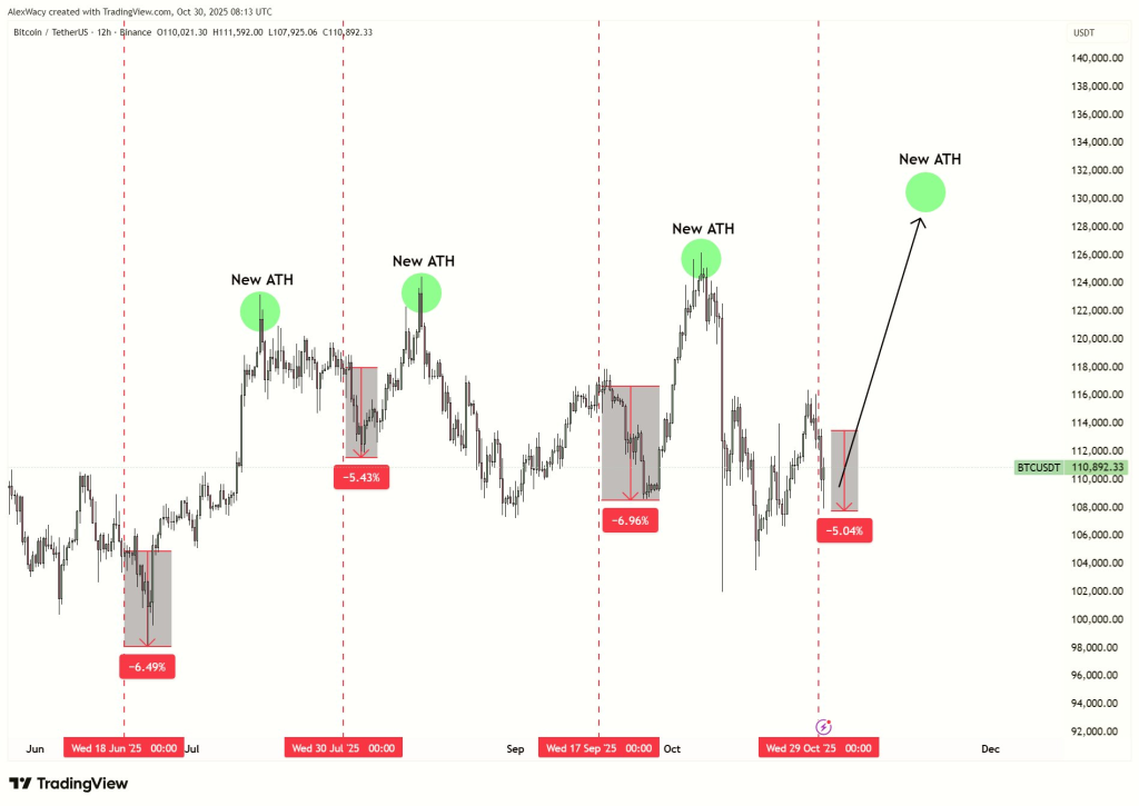 Following the FOMC decision yesterday, Bitcoin reversed from highs to $107,000. Analysts note a recurring pattern suggesting preparation for a new all-time high above the previous $126,270 peak reached on October 6, 2025.
