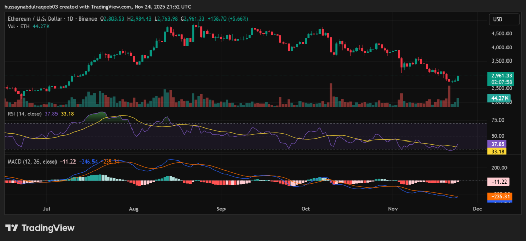 Ethereum Tests $2,961 Amid Oversold Indicators and Volume Surge