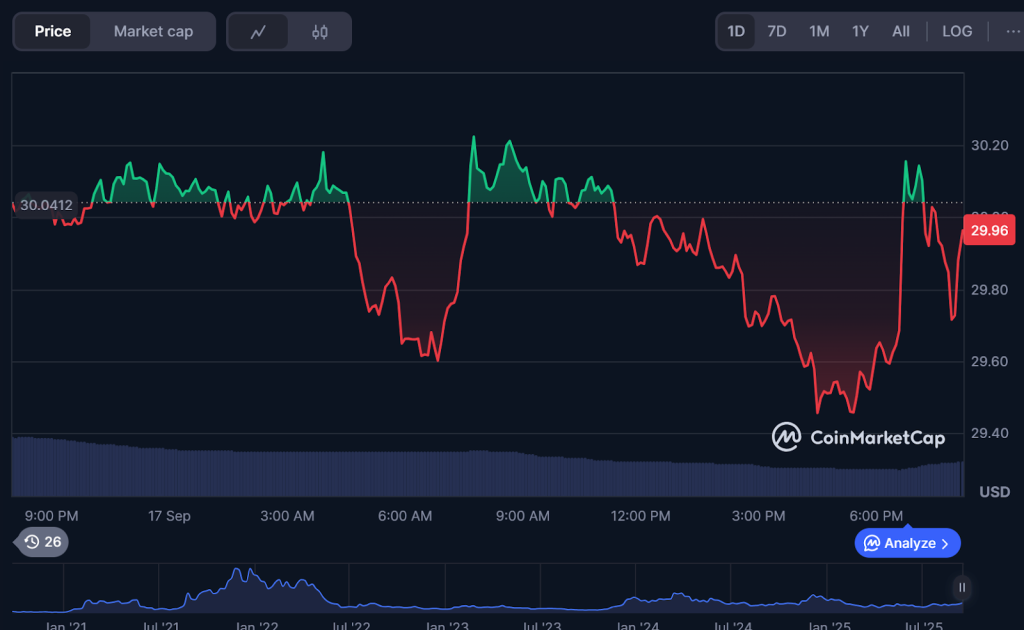 AVAX jumped about 7% after Bitwise filed an S-1 for a spot AVAX ETF with the SEC, breaking above the $30 resistance level. Volume surged past $1.2 billion in the same period. Over the prior 24 hours, AVAX gained from roughly $28.50 to its current price near $30, riding optimism over institutional interest and clear pricing benchmarks.