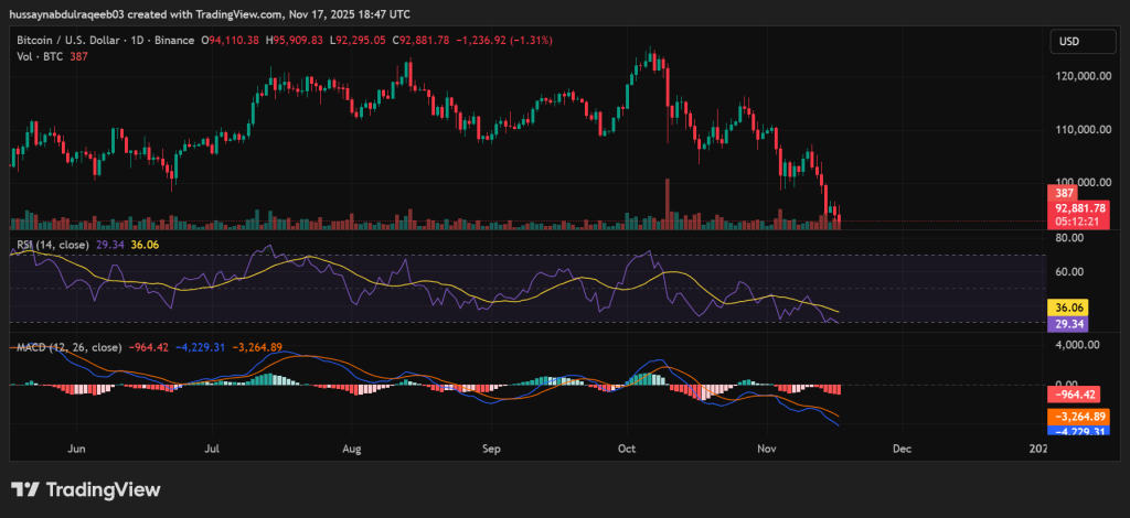 Bitcoin fell below $94,000 on November 17 and is now trading at $92,698.93, marking a 1.43% daily decline and a 12.43% loss over the past week.