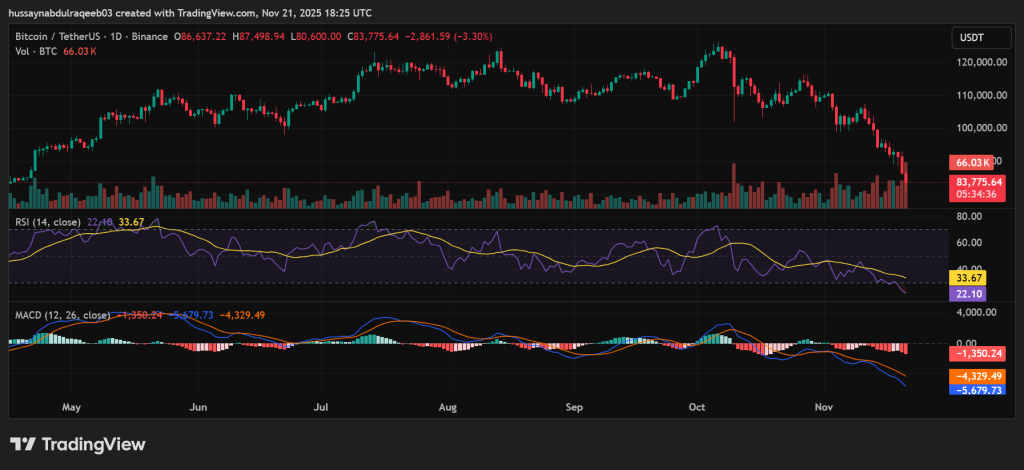 The price action displays a distribution pattern from October through November with lower highs. No immediate stabilization signals appear in current price action. The $80,000 level represents crucial support; a break could accelerate moves toward $66,000.