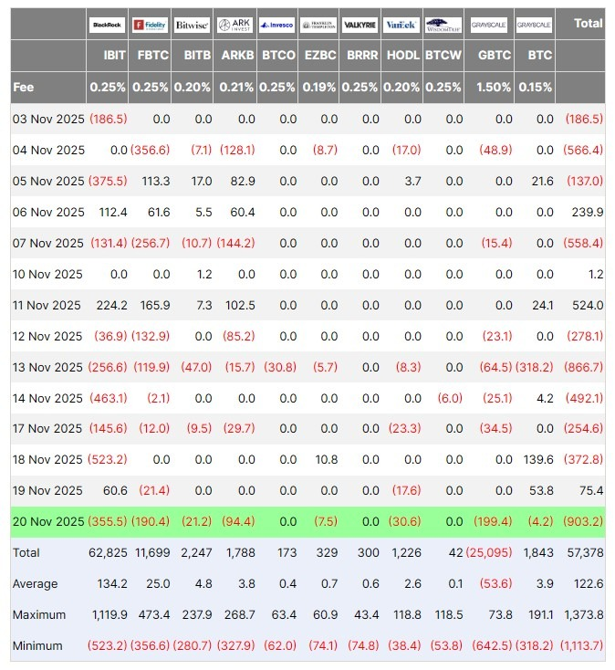 A single-day withdrawal of $903 million on November 20 marked the largest daily exit since the ETFs debuted. BlackRock’s IBIT alone lost 4,108 BTC worth $350.42 million today, according to Lookonchain.