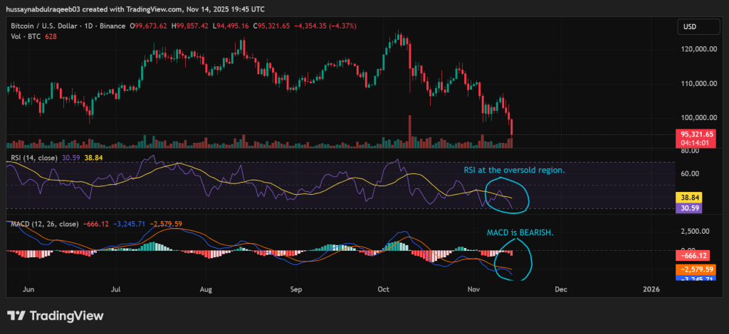 Bitcoin broke below the critical $100,000 psychological support level, testing the $94,000 to $92,000 zone. The price trades at $95,321, representing a 20% correction from the October 2025 all-time high near $120,000.
