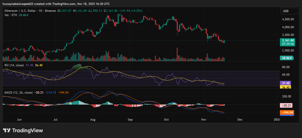 Ethereum briefly fell below $3,000 for the first time since July, marking a four-month low and a 40% drop from its August all-time high of $4,946.05. The coin currently trades at $3,095.27, down 1.02% in 24 hours and 10.76% over the past week.