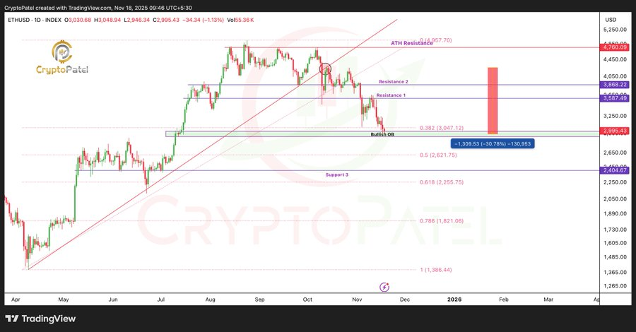 One analyst on X noted that ETH completed a major bearish move from the $4,000 breakdown level to the $3,000 zone, meeting the expected target from earlier breakdown structure.