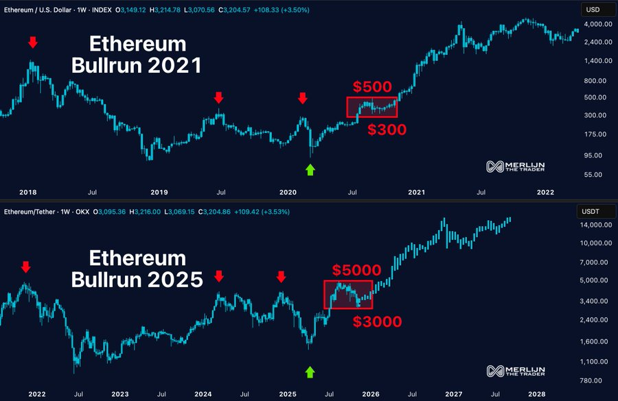 Another trader on X pointed out that Ethereum’s recent 38% drop mirrors its 2020 crash, suggesting a fear-driven setup similar to what preceded its last major breakout.