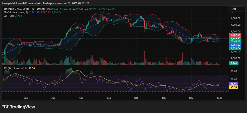 Bollinger Bands contract around current price levels, indicating a volatility squeeze. A decisive break above $3,100 with volume confirmation would target $3,200-$3,500. Failure to hold $2,950 support risks retesting $2,750-$2,800. Price trajectory remains neutral with a slight bullish bias pending breakout confirmation.