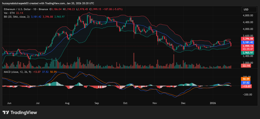Ethereum fell below the $3,000 mark on January 20, 2026, dropping 7.15% in 24 hours to trade at $2,987.45. The decline came despite the network processing record-high daily transactions and offering historically low gas fees.