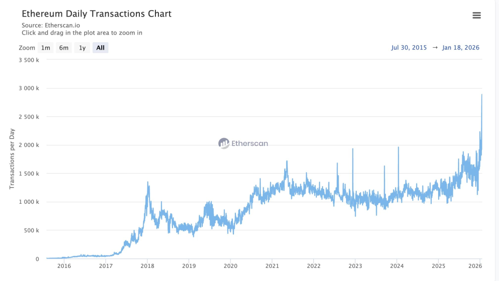 Ethereum’s seven-day moving average of transactions is nearing 2.5 million, a record high nearly double its value from one year ago. Transaction activity has surged significantly since mid-December.