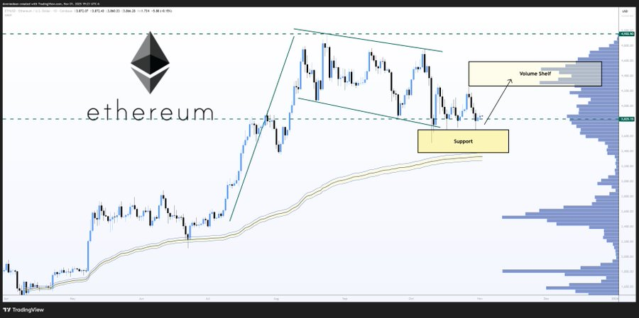 The asset grinds at key support levels with major short-side liquidity above current prices. Market observers suggest Ethereum may have bottomed within its current range.