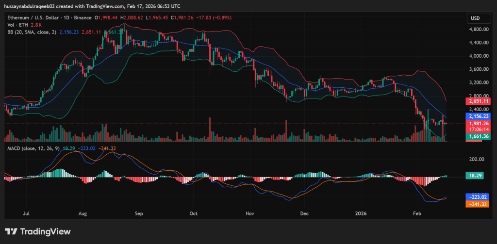 Ethereum trades near $1,980 as the second-largest cryptocurrency prepares to close its sixth consecutive month in negative territory. The asset has posted 11 red monthly closes out of the last 14 periods, placing it among the most prolonged bearish stretches in recent memory.