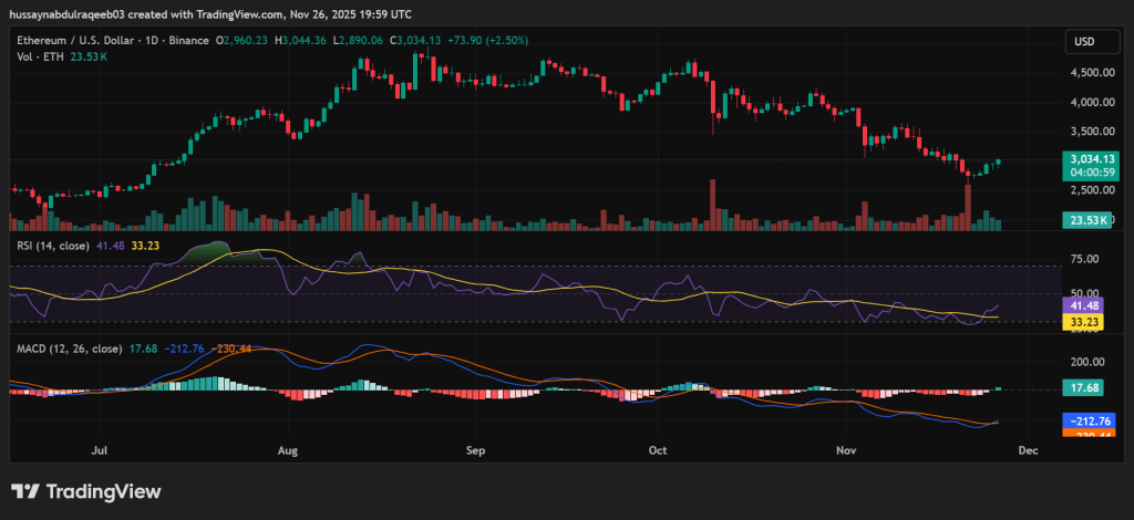 Ethereum Tests $3,034 with RSI Recovery and Key Resistance at $3,100