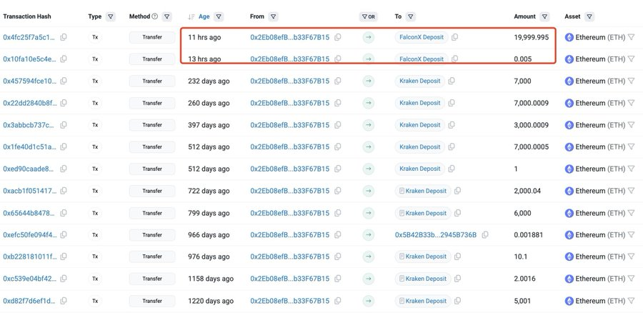 An early Ethereum ICO investor offloaded 20,000 ETH worth $58.14 million through FalconX. The investor’s original allocation of 254,908 ETH cost only $79,000 and is now valued at $757 million, representing a 9,582x return.