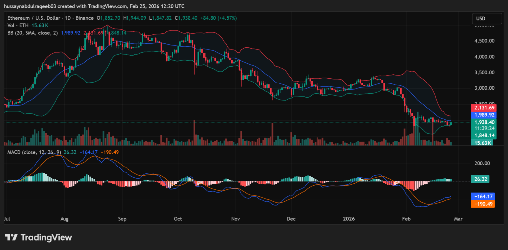 - Ethereum climbed 5.48% to $1,926 but remains down 33.49% monthly amid macro-driven recovery.
