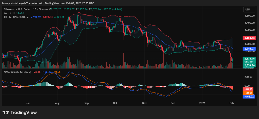 Bollinger Bands reveal significant volatility expansion. The upper band sits at $3,555.18, the middle band at $2,945.07, and the lower band at $2,334.96. ETH currently trades just $40 above the lower band, indicating extreme bearish pressure.