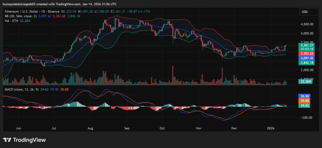 Ethereum surged past $3,300 on January 14, 2026, as network activity reached unprecedented levels. The second-largest cryptocurrency by market cap gained 5.1% in 24 hours, trading at $3,377.32. Weekly gains climbed to 7.48%, pushing Ethereum’s market capitalization above $407 billion.