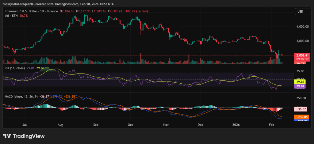 Ethereum trades at $2,029.16 as the second-largest cryptocurrency tests the critical $2,000 psychological support level. The asset posted a modest 0.76% gain in the past 24 hours but remains down 11.61% over the past week. Its market capitalization now stands at approximately $244.32 billion.