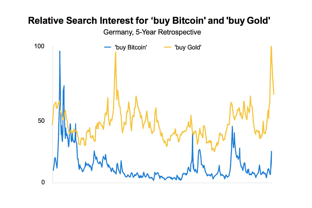 Meanwhile, public interest data shows gold still dominates mainstream attention. Google Trends data from Germany reveals the search term “buy gold” reached a five-year high of 100 several weeks ago and currently stands at 64.
