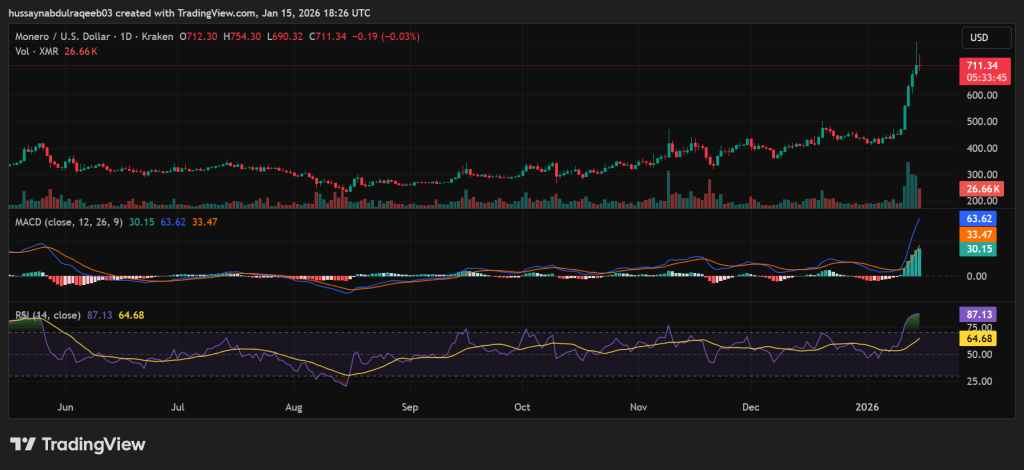 Monero has surged 56% in the past week, pushing past its eight-year-old peak and reclaiming dominance in the privacy coin sector. The token reached $797.73 on January 14, marking a new all-time high. XMR now trades at approximately $702.94, holding a market capitalization above $12.98 billion.