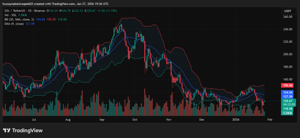 SOL trades at $125.67 on the daily chart, positioned near the lower Bollinger Band at $118.58. The upper band sits at $150.50, with the middle band at $134.54. This positioning near the lower boundary suggests oversold conditions.