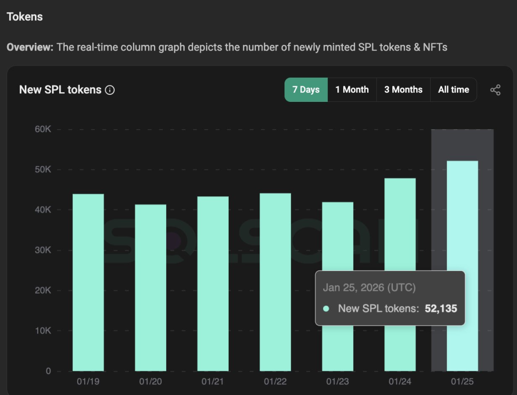 Meanwhile, the network captured top positions in revenue generation and decentralized exchange volume. Over 52,000 new tokens launched on Solana within a 24-hour period, marking the highest level in five months.