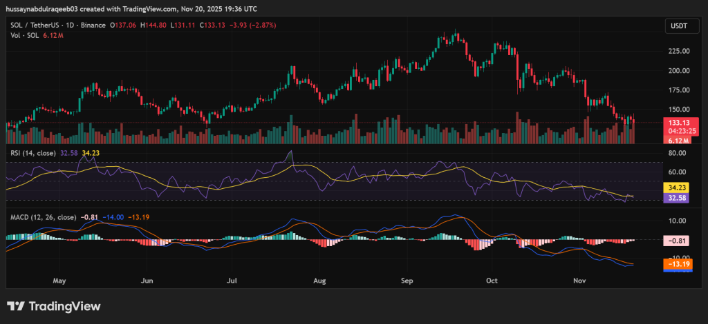 SOL currently trades in a confirmed downtrend, declining approximately 41% from November peaks near $225. The asset tests critical support at $130-$133 with bearish momentum intact across indicators.