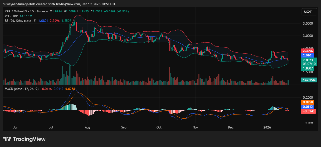 XRP has broken below the $2.05 Fibonacci support level and the 50-day simple moving average. The token now trades near the lower Bollinger Band at $1.85. The middle band at $2.08 serves as immediate resistance.